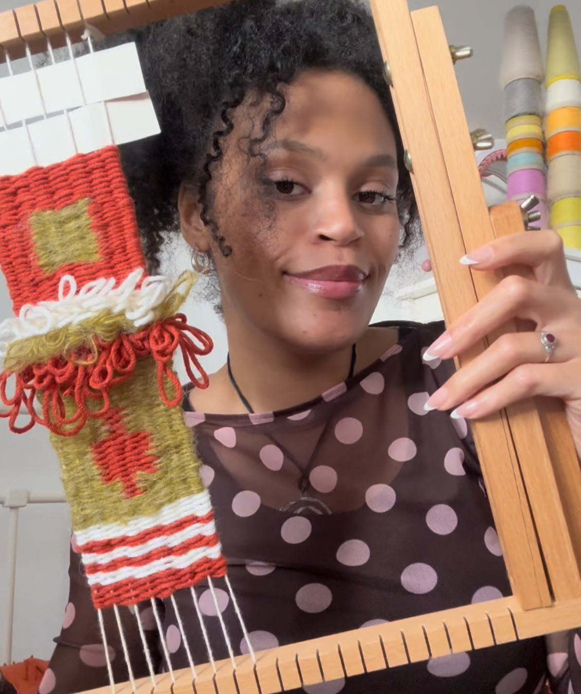 Ashanti Farquhar (she/her) has been weaving for over 7 years. She has a BA in textiles from the University for the Creative Arts, Farnham, and a textile MA from the Royal College of Arts, London. Being of Jamaican heritage, weaving is a rich, cultural tradition. In her own practice, she creates large hand woven, hand dyed tapestries and wall hangings using Ikat, inspired by her own heritage. You can follow Ashanti’s instagram @ashantiarttt